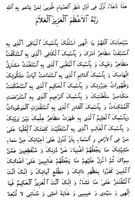 This is a prayer that was sent down on the first day of the month of fasting. Well is it with him that supplicateth God—his Lord, the Most Great, the Almighty, the All-Knowing—therewith.