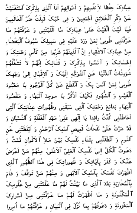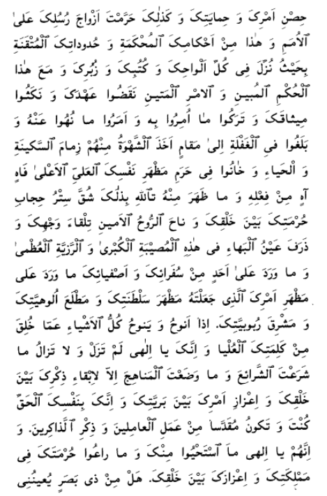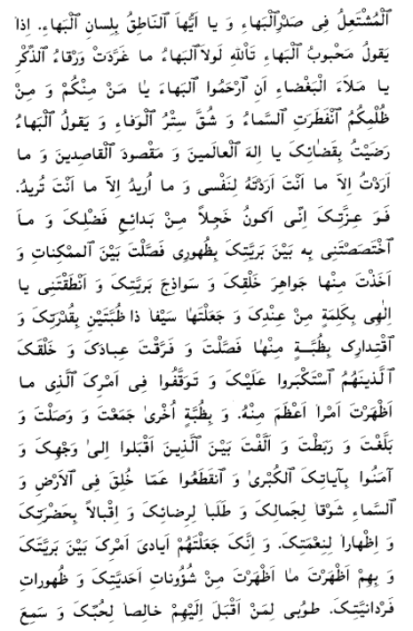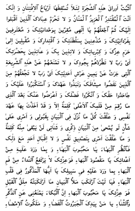 I beseech Thee, O my God and my Master, to ordain for Thy servants what Thou hast ordained for me. Make Thou no distinction between me and them, neither in this world nor in the world to come. Thou, verily, art the Fashioner of all creation. O my God! Make firm the leaves of this Tree, lest the tempests of trials should cause them to fall. Thou, in truth, art the Almighty, the All-Glorious, the Beneficent. Deprive not, moreover, those of Thy servants that have set their faces towards Thee. Enable them, O my God, to bear witness to Thy oneness, to acknowledge Thy singleness, to recognize Thy sovereign might, to turn towards the sanctuary of Thy glory and grandeur, to repair unto Thee for refuge, and to seek Thy presence for protection. Cast them not away, O my Lord, by Thy grace, and withhold them not from this river that hath flowed from the right hand of the throne of Thy oneness. Suffer them not, O my Lord, to be numbered with them that have broken Thy Covenant, violated Thy Testament, waxed proud before Thee, disputed Thy truth, rejected Thy grace, and turned away from Thee, all in spite of the fact that not a single word hath been inscribed by Thy Supreme Pen wherewith Thou didst not enter into a Covenant with me.