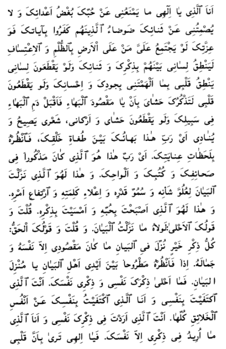 Thou didst condition all that hath been sent down in the Bayán upon mine acceptance and my behest, in such wise that if my mention and praise were to be effaced therefrom, not one word would remain thereof. Thou hast not, moreover, made my Cause dependent upon the approval of any one. And yet, look Thou upon Bahá, O Thou Who art his Beloved, and behold what hath befallen him at the hands of Thine adversaries, O Thou Who art his heart’s desire! Thy might beareth me witness that not a single cry hath escaped the lips of Bahá to bemoan the things that have befallen him in Thy path, O Thou Who art the Source and Center of his soul. O would that the people of the Bayán not repeat the transgressions of peoples past! I swear by Thy glory, O Best-Beloved of Bahá, that my bitter weeping hath prevented me from making Thy mention and celebrating Thy praise, O Thou in Whose hands are the dominion of decree and the kingdom of ordainment. I am he, O my God, whose love of Thee the enmity of Thine enemies hath failed to hinder, and the one whose praise of Thee the clamor raised by them that have disbelieved in Thy signs hath been powerless to silence. By Thy glory! Were all the peoples of the earth to unite against me in tyranny and oppression, verily my tongue would proclaim Thy mention and praise in their midst. And were my tongue to be cut out, verily my heart would impart the things wherewith Thou didst inspire me through Thy bounty and beneficence. And were my heart to be severed from my body, verily my vitals, my limbs, and the hair of my head would shout aloud: