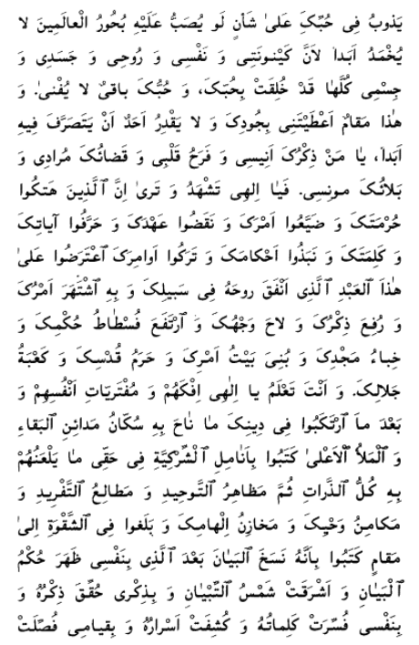 O my God, my Master, my heart’s desire! I bear witness that Thou indeed hast ever been the One Whom all things worship, one and alone, without peer or equal, eternal in the past, eternal in the future, ever-abiding, independent of all things, and self-subsisting. Thou hast taken neither partner nor peer unto Thyself. Unto Thy servants Thou didst send Thy messengers, and make them the repositories of Thy revelation and the treasuries of Thy knowledge, and send down unto them Thy Books in which Thou didst prescribe Thy laws and ordinances, until such time as the Scriptures were culminated through the revelation of the Bayán, and the Messengers attained their final consummation through the one Thou didst name ʻAlí [The Báb] in the Realm of Decree and the Kingdom of Names. He, in truth, made himself manifest at Thy bidding, summoned all men unto Thee, and bore the glad-tidings of him whose advent Thou didst herald in Thy perspicuous verses and Thy weighty words. Through him, Thou didst prescribe the scope of Thy laws and ordinances, and didst give a distinct explanation of all things, in which Thou didst forbid Thy servants to shed the blood of them that have believed in Thee and have entered the stronghold of Thy command and Thy protection.