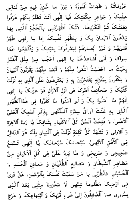 O my Lord! Illumine the eyes of Thy servants with the light of Thy knowledge, and give them to drink of those living waters that shall detach him that quaffeth them from the kingdoms of heaven and earth; shall prompt him to turn, with his all, towards Thee; and shall cause him to abide beneath the shade of Thine all-glorious Name, which Thou hast made the sword of Thy Cause amidst Thy creation, and whereby Thou hast separated between the well-favored and the wayward, between light and darkness, between felicity and misery, and between the exponents of truthfulness and the embodiments of denial. He whose sight hath been illumined with the light of Thy Most Great Name hath, in truth, been created anew and raised up at Thy behest, O Lord of the throne on high and of earth below. Such a one is, indeed, a new creation in Thy realm, fashioned by the fragrances that have been wafted in Thy days. He is recreated through that which he uttereth in Thy remembrance and praise, though he repeat such things as have been ever said in Thy glorification. Such is the station of Thy servants that have been brought into being through the movement of Thy Supreme Pen in the kingdom of creation. And yet, Thy wicked servants reject Thy verses, O Thou Who art without peer on earth or in heaven, and would fain deny their novelty—notwithstanding that through these verses the very concept of novelty hath been established, and that if not for them originality itself would never have come into existence.