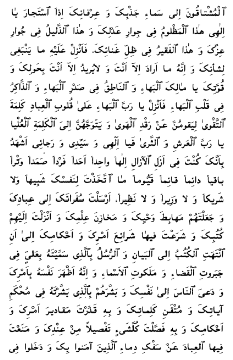 This wronged one, O my God, hath sought the shelter of Thy justice, this lowly one hath longed to abide within the precincts of Thy glory, and this poor creature hath yearned to take refuge beneath the canopy of Thy wealth. Send down upon him, then, that which beseemeth Thee. He, in truth, hath had no desire but Thee, and He possesseth no such desire now. I adjure Thee by Thy power and might, O Thou Who art the King of Bahá—Thou Who speakest within the breast of Bahá, and rememberest within the heart of Bahá! Send down, O my Lord, the word that shall strike the fear of God in the hearts of men, that they may shake off the slumber of their corrupt desires and turn their faces unto the Most Exalted Word, O Lord of the Throne on high and of earth below.