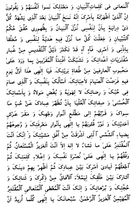 This is, O my God, the first of the days on which Thou hast bidden Thy loved ones to observe the Fast. I ask of Thee by Thy Self and by him who hath fasted out of love for Thee and for Thy good-pleasure—and not out of self and desire, nor out of fear of Thy wrath—and by Thy most excellent names and august attributes, to purify Thy servants from the love of aught except Thee and to draw them nigh unto the Dawning-Place of the lights of Thy countenance and the Seat of the throne of Thy oneness. Illumine their hearts, O my God, with the light of Thy knowledge and brighten their faces with the rays of the Daystar that shineth from the horizon of Thy Will. Potent art Thou to do what pleaseth Thee. No God is there but Thee, the All-Glorious, Whose help is implored by all men.
