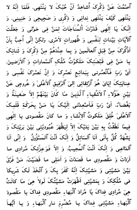 O Thou Who art my God, my Master, my Beloved, my highest Hope, and mine ultimate Aspiration! Remove not far from Thee him that hath sought nearness unto Thee, and cast not away him that hath set his face towards the transcendent court of Thy singleness and the hallowed precincts of Thy oneness. Enable them to hear, then, what shall cause them to soar in the atmosphere of their longing for Thee and the firmament of their rapture of Thee, in such wise that they shall become oblivious of all that is not Thee, and moved to celebrate Thy mention and praise. By Thy glory! Whoso remaineth deprived of the sweetness of Thy remembrance hath, in truth, been kept back from every good thing. For such a one, his death would be better than his life, and his extinction preferable to his continuance. As to me, and to this Thy glory beareth me witness, I am bewildered at them that have withheld themselves from the wonders of Thy remembrance, and have busied themselves with the mention of aught else but Thee. I swear by the power of Thy might that, for them that have tasted the sweetness of communion with Thee, Paradise itself—and whatever of Thy wondrous gifts and favors as can be found therein—can never compare with even a single mention of Thee. Debar me not therefrom, then, and deprive me not thereof. I beseech Thee, moreover, O Thou in Whose hand is the kingdom of decree, to stir me with the winds of Thy Will as Thou pleasest, that I may turn towards that which is met with Thy love and good-pleasure, and repudiate that which Thou abhorrest, O Thou in Whose grasp are the kingdoms of this world and of the next. There is none other God but Thee, the Almighty, the All-Subduing, the Most Powerful, Whose help is implored by all men.