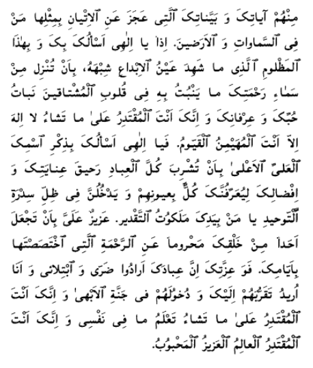 Glorified art Thou, O my God! I beseech Thee by Thy Name, the Eternal, through which the Manifestations of Thy Cause have existed perpetually; by Thy Name, the All-Sufficing, through which every need of the Embodiments of Thy Revelation hath been satisfied; by Thy Name, the Lord of Wealth, through which the dawning-places of Thine inspiration have been made so rich as to be self-sufficient; by Thy Name, the Ever-Abiding, through which the signs of Thy kingdom and the evidences of Thy dominion have been made to subsist forevermore; by Thy Name, the All-Wise, through which the Repositories of Thy sovereignty were vouchsafed with abiding endurance; by Thy Name, the Most Compassionate, through which every being hath entreated Thy mercy; by Thy Name, the All-Powerful, through which all living things have implored Thy strength; by Thy Name, the All-Knowing, through which the Manifestations of Thy knowledge have appeared amidst Thy creation; and by Thy Name, the All-Subduing, through which Thou hast caused Thy most exalted Word to conquer all who are in heaven and on earth, to send down upon Thy loved ones—from the heaven of Thy Will—what will make them able to dispense with all else but Thee, and detach them from all else except Thee. Send down upon them, moreover, that which shall empower them to vanquish Thine enemies, who have disbelieved in him who is the manifestation of Thine Essence and the Dawning-Place of Thy Signs. Potent art Thou to do what Thou willest, and Thou, verily, art the Almighty, the All-Wise.