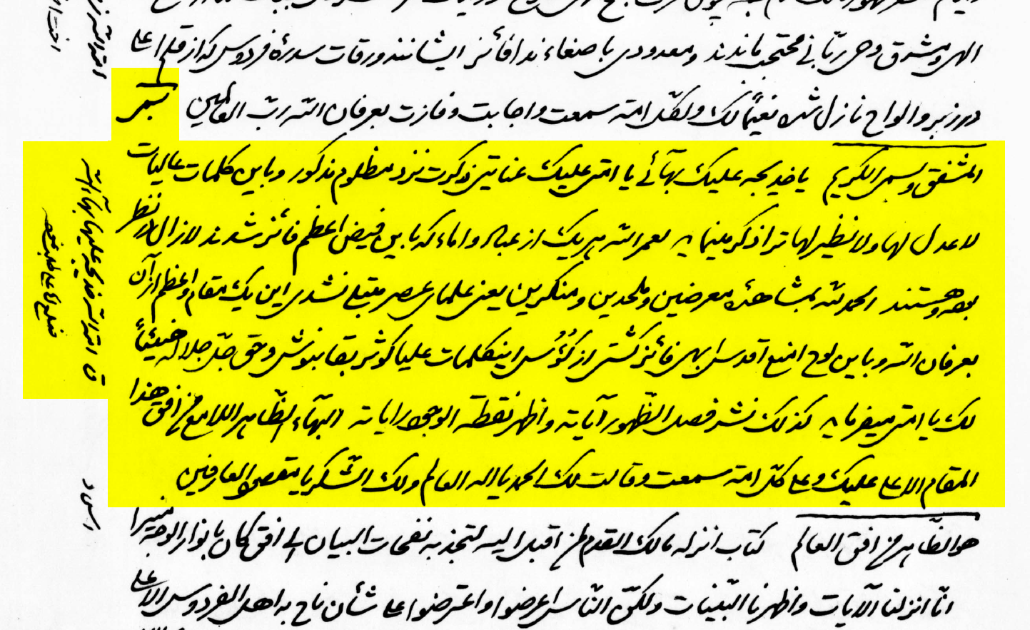 [3] Originally faḍl (فضل), per the manuscript apparently in the handwriting of Bahá’u’lláh. The British Library manuscript has فصل , which as a noun would presumably be fuṣal (فُصَل), the plural of faṣl (“chapter”), in which case this clause would mean something like: “Thus have the chapters of revelation spread their verses…” However, this reading seems unlikely to me because, as a plural noun, fuṣal would be grammatically inconsistent with the singular hi ( هِ ) attached to áyátihí (آیاته), meaning “its signs” or “its verses.”