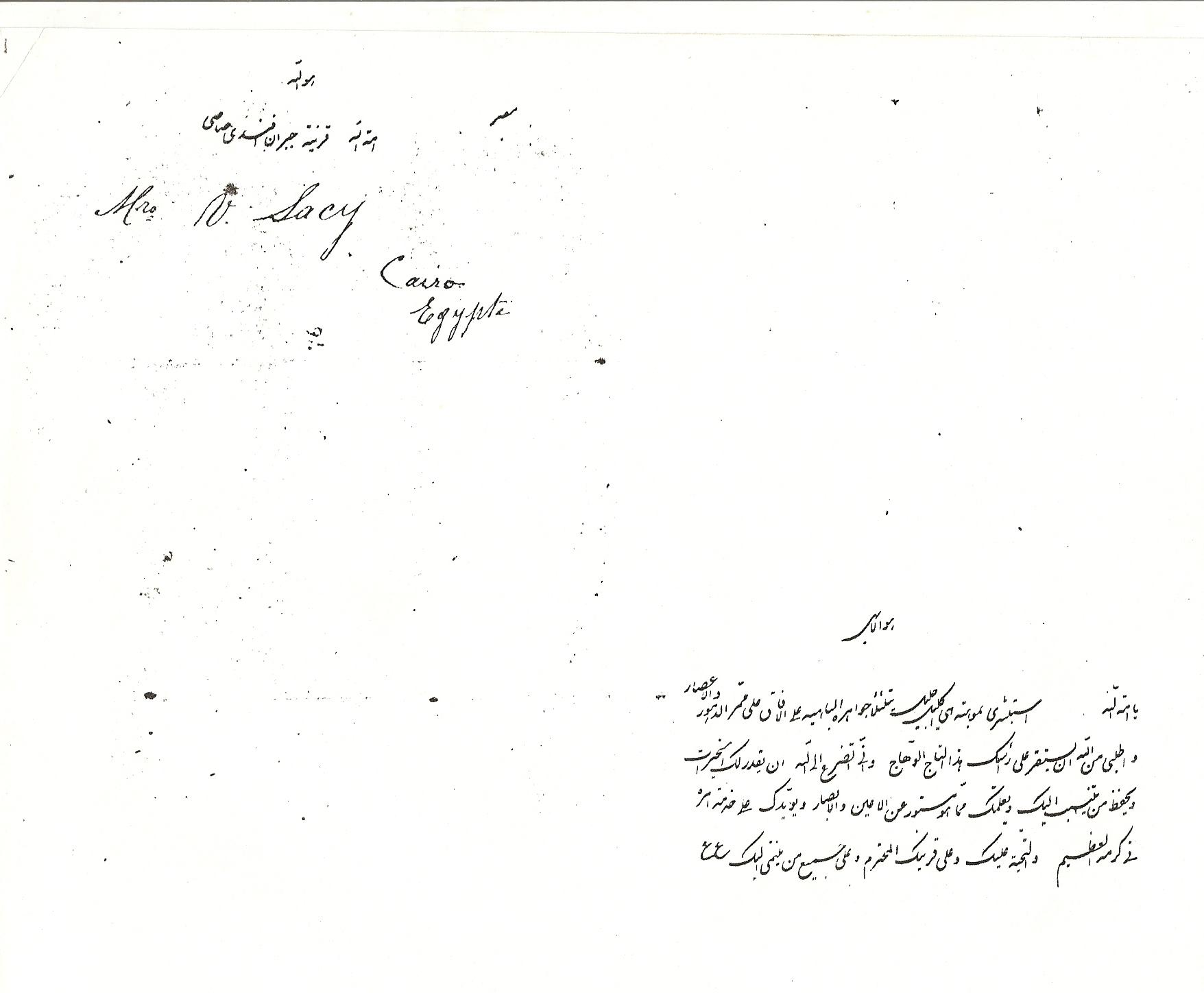 This Tablet was addressed to Madeleine Sacy. Her husband was Gabriel Sacy (20 November 1858 – 21 March 1903), an Egyptian Catholic and Martinist who seems to have become a Baháʼí around the turn of the twentieth century, apparently under the guidance of Mírzá Abu’l-Faḍl Gulpáygání, who was also living in Egypt at the time. Sacy spoke seven languages, studied at the Syrian Protestant College (now the American University of Beirut), and worked as the head of the personnel office at the Ministry of Finance in Cairo. E.G. Browne writes that Sacy “had become a fervent Baháʼí with a very remarkable faculty for interpreting the prophecies of the Old and New Testaments, especially those of the Book of Daniel and Revelation, in support of the Bábí and Bahá’í claims” (Materials for the Study of the Bábí Religion, pp. 185–86).